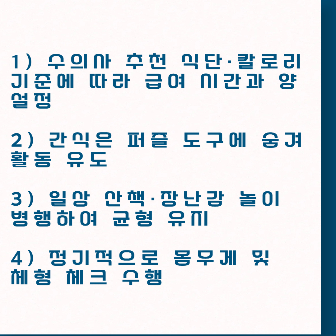 - 저칼로리 간식: 당근·오이 등 자연 간식 사용 권장